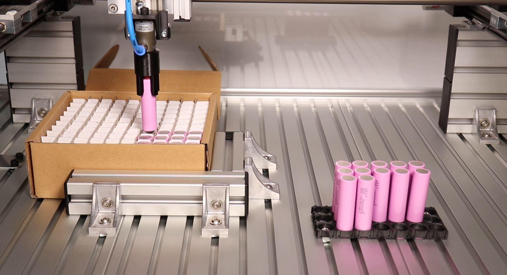 The system automates battery cell removal and placement, optimizing workflows in battery assembly lines for industries such as automotive and electronics.
