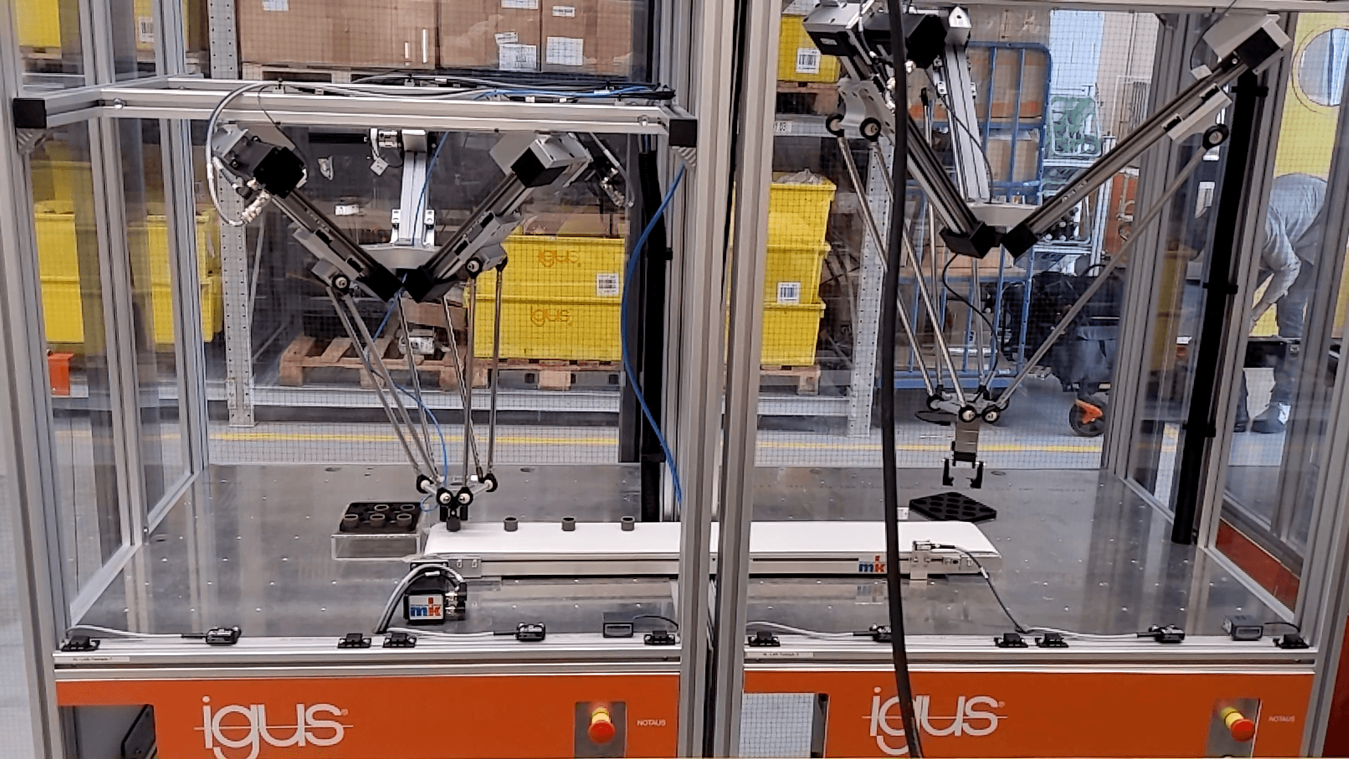 In this application, two Delta robots were strategically positioned at the end of a Kitz assembly line to demonstrate seamless partial automation. The first robot places components onto the conveyor belt, while the second robot removes and sorts them. This setup showcases how multiple Delta robots can work collaboratively to streamline workflows, enhancing productivity without significant complexity. The igus® Delta robots offer flexibility with 2-axis versions (400 or 700 mm) and 3-axis models (360 or 660 mm working space), ensuring adaptability for diverse operational needs.