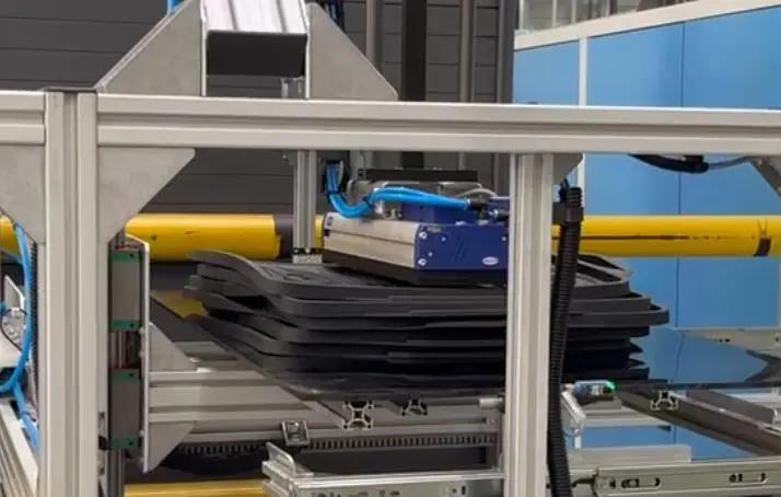 The system automates sorting and transport of floor mats for industries like automotive manufacturing or logistics, ensuring safe and reliable material handling.