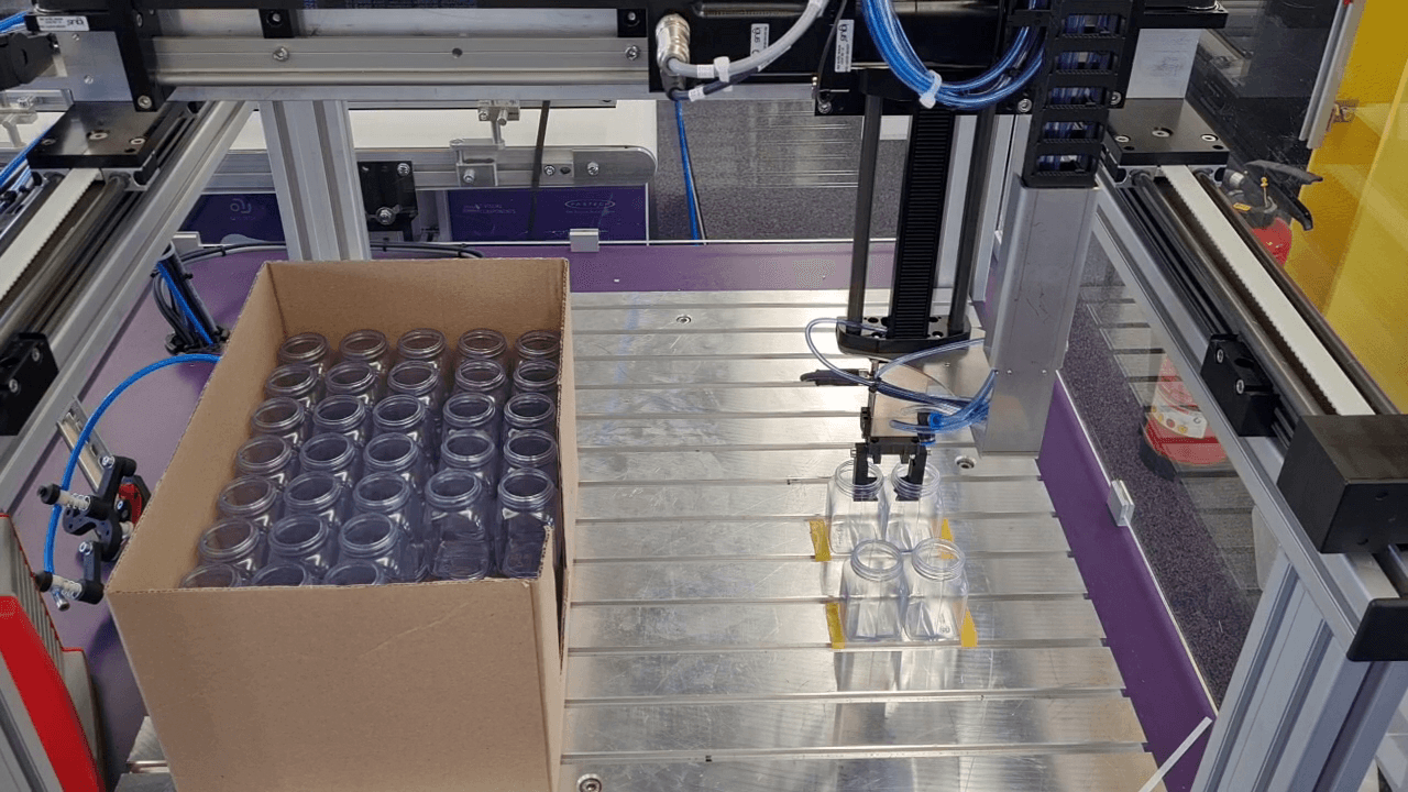 In this application, partial automation was implemented to optimize a packaging process. Using a parallel gripper mounted on an igus space gantry, the system handles two glasses simultaneously, placing them directly into cartons. This approach automates repetitive tasks, allowing employees to focus on higher-value activities and improving workflow efficiency. With 3 degrees of freedom, the igus space gantry provides versatile motion, enabling a wide range of tasks within its workspace. The Schunk parallel gripper, capable of a 2.05 kg gross payload and a maximum gripping force of 300 N, ensures reliable and secure handling of delicate items.