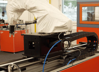 In this customer application, an igus Robolink DP jointed-arm robot was mounted on a drylin seventh axis, effectively expanding its working range for larger tasks. To enhance performance in challenging environments, the robot was equipped with a custom protective cover, providing reliable shielding from dust, debris, or other external factors. This setup combines the flexibility of the drylin axis with the durability of the protective cover, demonstrating the adaptability of igus robotic solutions across a range of demanding industrial conditions.